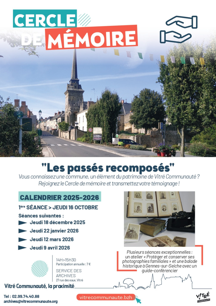 Le Centre des Archives de Vitré Communauté, en partenariat avec la Ville de Vitré et son CCAS, vous invite à participer au Cercle de mémoire "Les Passés recomposés".