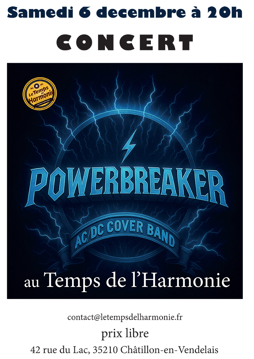 Le groupe Powerbreaker viendra animer une soirée par ses reprises du groupe AC/DC au Temps de l'Harmonie à Châtillon-en-Vendelais le samedi 6 décembre à 20h.