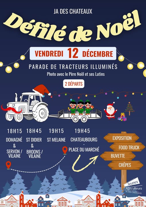 Les Jeunes Agriculteurs des cantons de Châteaubourg et Châteaugiron vous donnent rendez-vous vendredi 12 décembre pour un défilé de tracteurs décorés, suivi d’une soirée festive ouverte à tous.