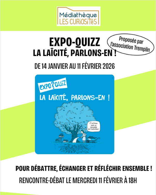 Une expo-quizz, supporte d'échange et de réflexion, proposée par l'association Tremplin de Vitré qui présente la laïcité : ce pilier de la vie publique en France intimement liée à notre histoire, qui est pour chacun d'entre nous, garante de liberté, d'égalité et de respect mutuel.