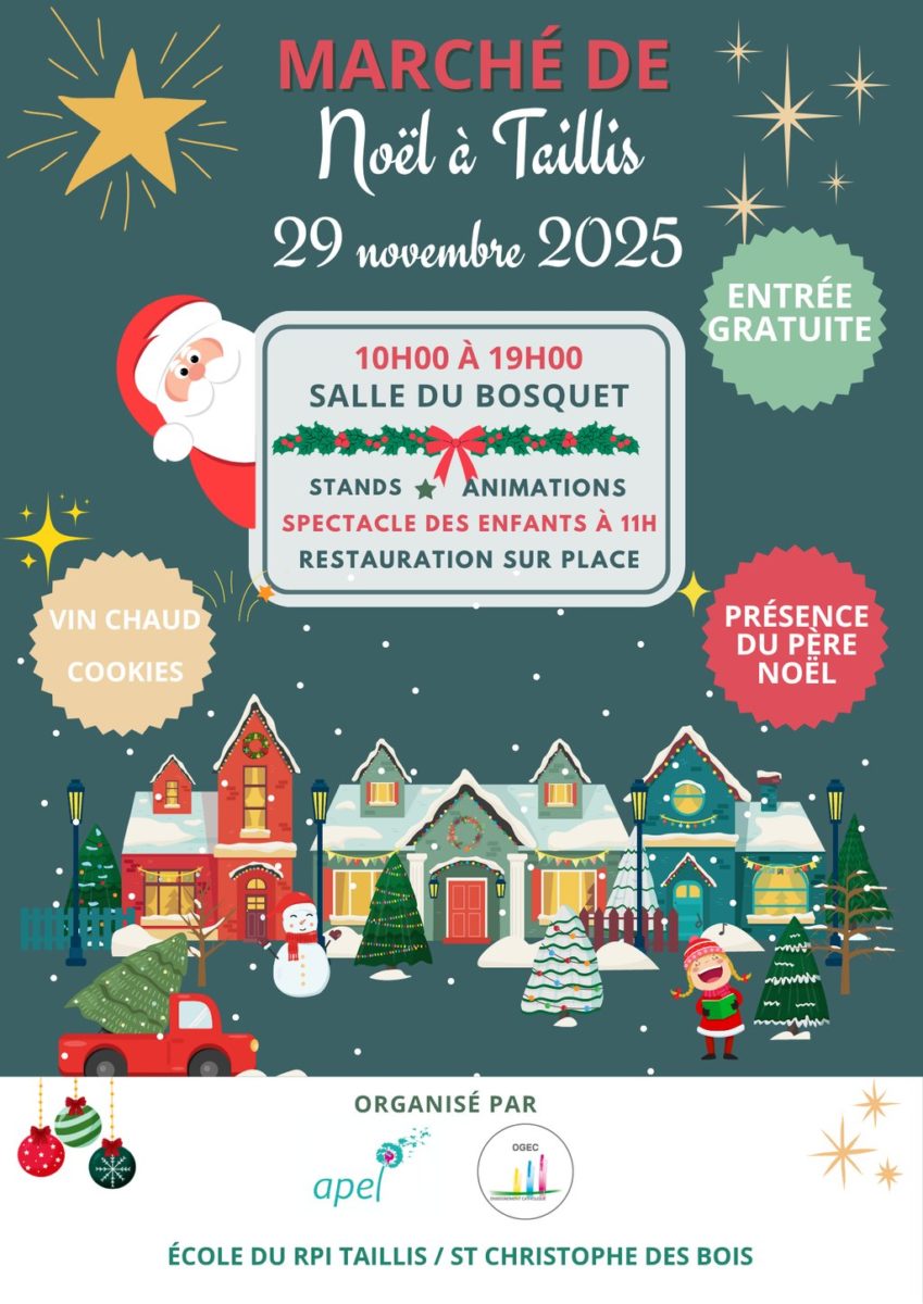 L'APEL et l'OGEC de l'école de Taillis St Christophe des Bois organise leur premier marché de Noël le samedi 29 novembre de 10h à 19h à la Salle du Bosquet de Taillis.