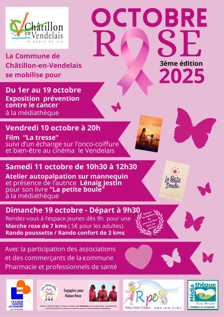 Octobre étant le mois dédié à la sensibilisation des femmes au dépistage du cancer du sein, la Mairie de Châtillon-en-Vendelais est de nouveau mobilisée cette année avec les commerçants, associations, professionnels de santé en partenariat avec les Vitrézelles et la Ligue contre le Cancer.