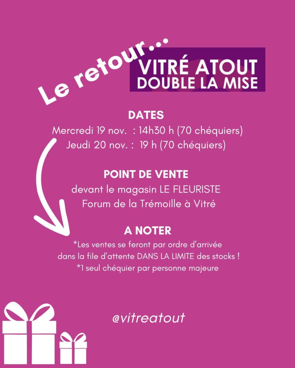 Les chèques-cadeaux seront utilisables du 21 novembre au 31 décembre 2025 (pas d’échange ni remboursement possible) chez les commerçants adhérents à Vitré Atout (liste au dos des chèques).