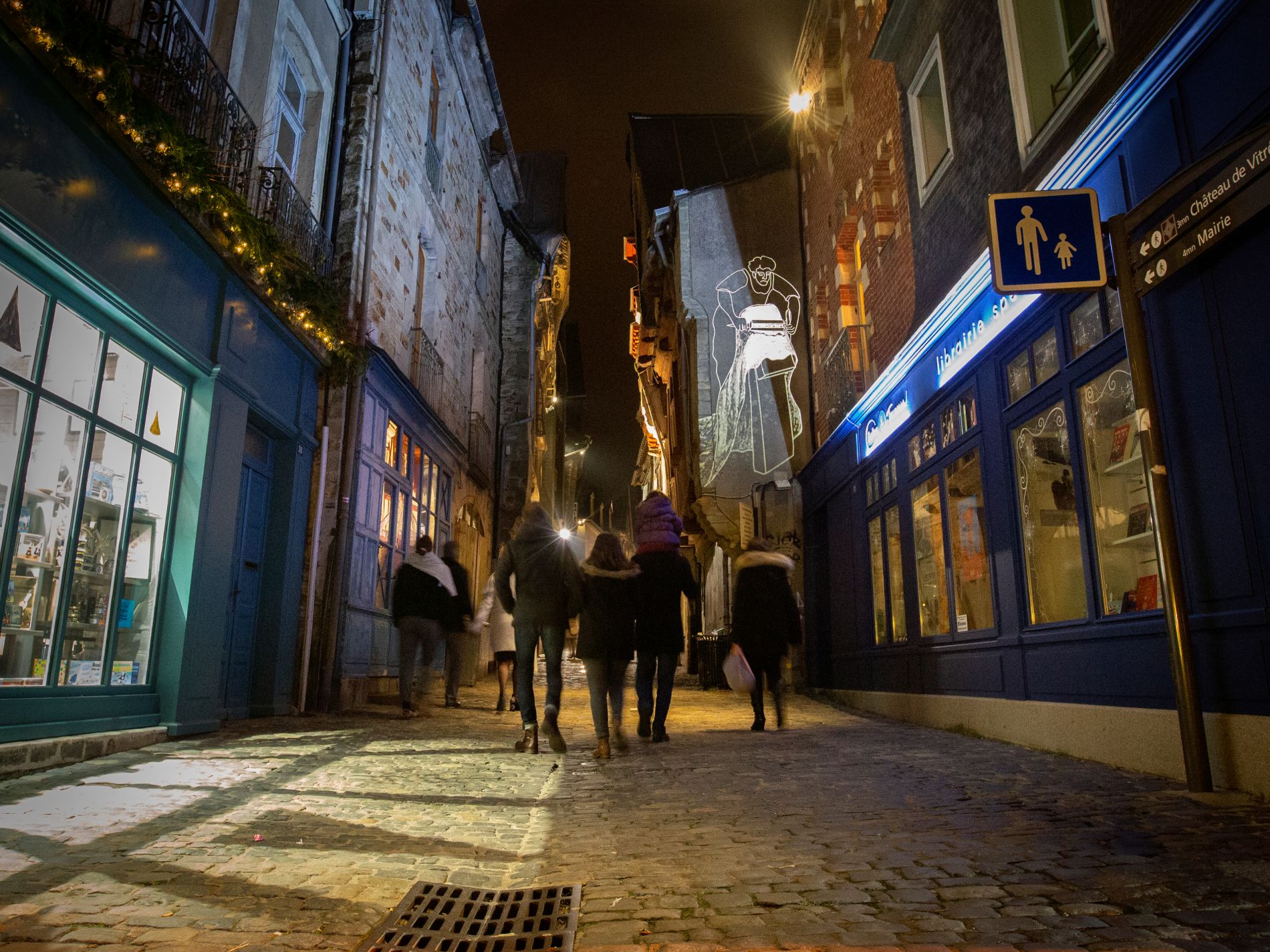Suivez les images qui apparaissent sur les murs, elles vous mèneront jusqu’au château de Vitré. Au XIe siècle, la ville jouit d’une position stratégique aux portes de la Bretagne. Sous vos yeux, ce dernier scintille de mille-feux, plus impressionnant que jamais. Jetez un œil au fossé du château pour découvrir en lumière les arts et loisirs à la cour des barons de Vitré. Continuez votre chemin vers la rue Notre-Dame : vous êtes attendus par le baron Robert III …